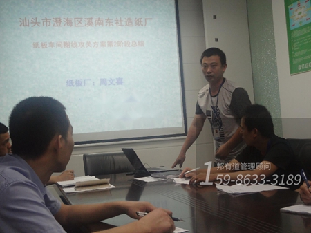 三、組織技術骨干研討,初步確定攻關動作、改善重點、形成方案。針對管理人員對效率提升各有建議,在實施過程重得不到好的反饋后便想著放棄的情況,邦有道管理咨詢公司成立攻關小組,以副總為統籌協調,以造紙廠廠長為動作實施的具體負責人,進行動作分解,分工;組織全體管理人員、班組成員,認真分析影響的原因,對可能存在的因素都列出來,然后逐條制定改善措施;由廠長牽頭根據討論的結果制定攻關方案,并讓全體成員、管理人員會簽;會簽之后的方案正式生效,大家必須按方案要求一個個動作去做,去執行