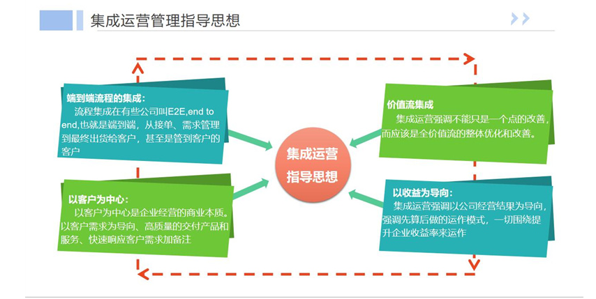 企業管理咨詢機構——邦有道管理顧問依照痛點問題的總結,將集成運營的指導思想進行劃分,分別為端到端流程的集成、價值流集成、以客戶為中心的思想以及以收益為導向的思想。詳情見下圖: