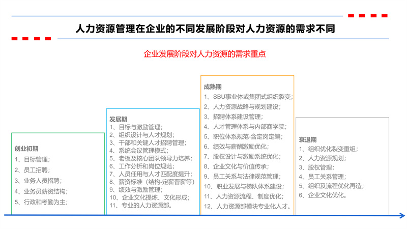 針對企業發展階段的劃分,邦有道企業管理有限公司將發展階段分為創業初期、發展期、成熟期以及衰退期。其中成熟期的人力資源管理體系的需求重點最高。