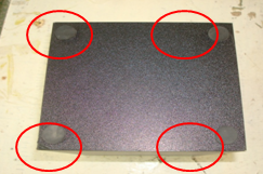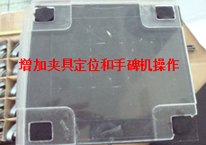 工藝改進方法:增加了夾具直接套到音箱面固定避免會移動,且膠腳位置固定防止貼出來的膠腳4個位置不對稱,膠腳定位孔固定了直接撕膠腳到定位孔上,共可減少兩個動作,用時15S。