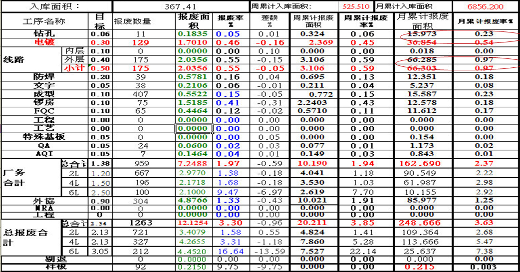 (1)開短路日均報廢面積:4.47㎡,線路報廢率0.97%;電鍍報廢率0.54%;