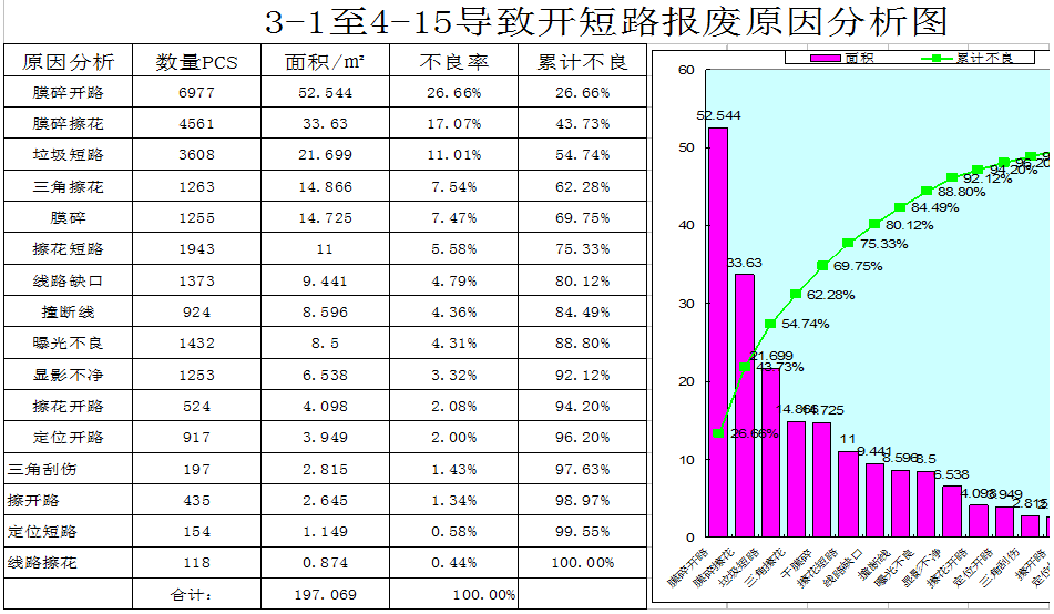 (1)通過統計分析(見下表),總結開短路報廢的主要不良因素是膜碎開路、膜碎擦花、和垃圾短路造成的;